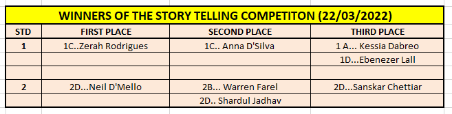 A storytelling competition was organized for the students of 1 & 2. They were encouraged to use appropriate use of voice modulation, gestures and facial expressions and lots of creative thinking.