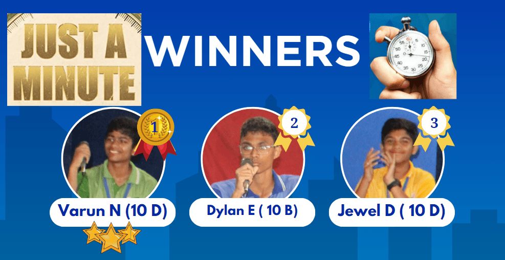 On the 7th, 8th and 9th of October, the Just a Minute Competition was organised for the students of classes 8,9 and 10.It brought together participants eager to demonstrate their wit, quick thinking, creativity and spontaneity. The contestants had exactly one minute to speak without hesitation, repetition, or deviation on the topic given to them. They tackled a variety of topics, from the light hearted ‘A samosa a day keeps the doctor away’ to the highly debatable ‘Messi is better than Ronaldo‘. Controversial topics such as ” Why PT periods should be banned in St Augustine’s School” and the baffling “Global warming is causing my hair to fall out” were handled with panache and ease.