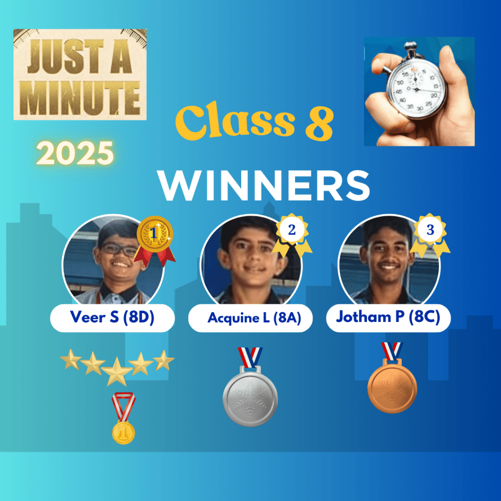 CLASS 8 – Class 8 students are first timers to the competition but they did a very good job too,Two of the main contestants were unfortunately absent on the day .This let Veer Satve romp home to first place. Acquine and Jotham did bravely and took 2nd and 3rd place.