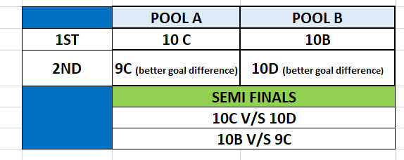 9C and 10D made it to the semis on account of better goal difference to 9B and 10A .It has been a very low scoring tournament so far.Only 15 goals have been scored across 12 games. There have been no hat tricks so far. Harshal (10C ) and Aariz (9C) lead the race for the Golden Boot with 2 goals each.The teams are not going to get a break to catch their breath. The semis are on today.