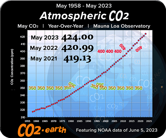 Take a look at the Keeling Curve ( It shows the yearly average amount of carbon dioxide in the atmosphere from 1958) updated upto June 2023.